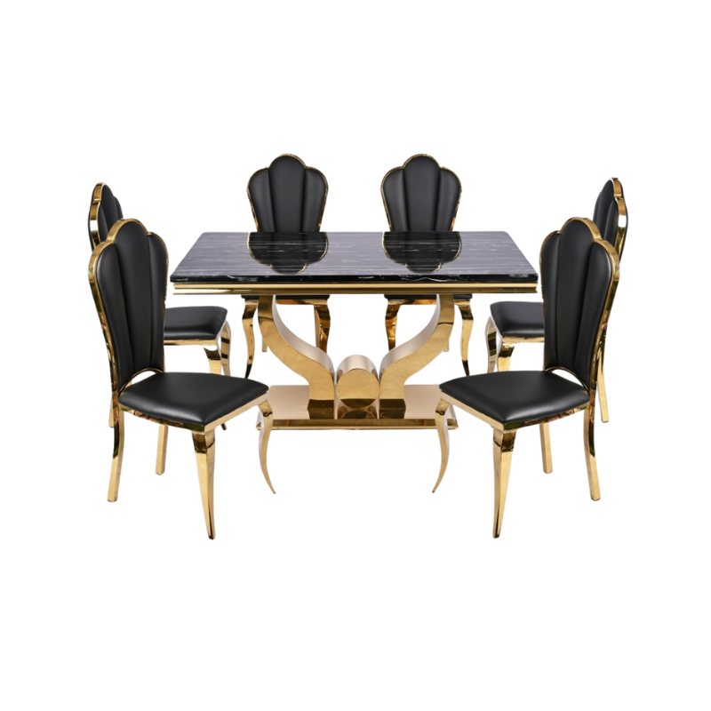 - Set Meja Makan: Paket ini termasuk meja makan marmer dan kursi hitam gold. Sempurna untuk ruang makan Anda. Tambahkan sentuhan mewah pada rumah Anda. 🏠