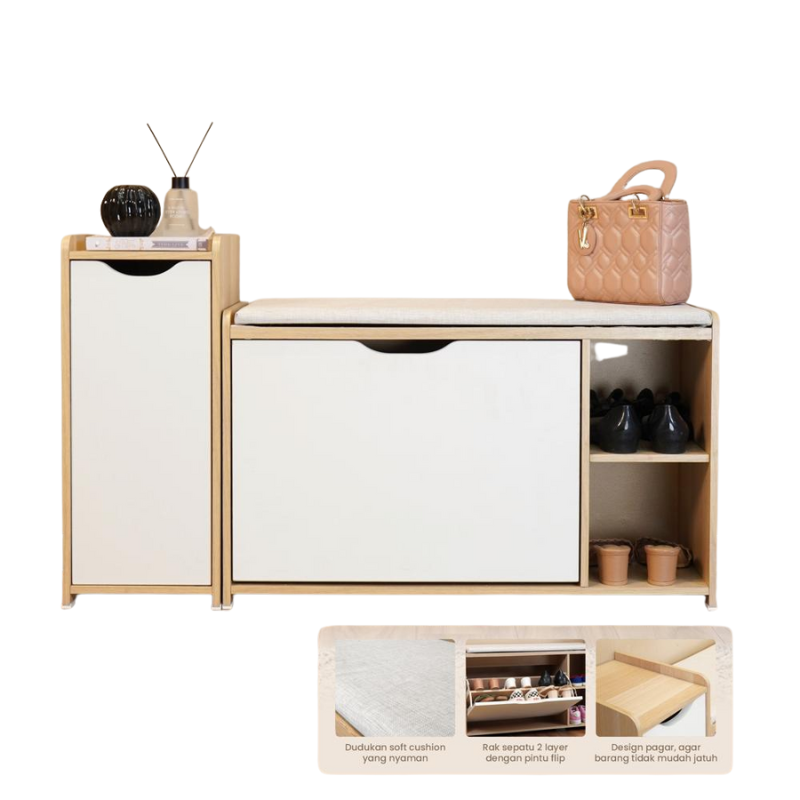 ✨ Material dan Ketebalan ✨ - Terbuat dari Grade A hardwood particle board, kualitas terbaik. - Ketebalan part 12 mm, laminasi paper untuk durabilitas lebih lama. - Desain dua bagian terpisah: 1 kabinet tinggi dan 1 bench.