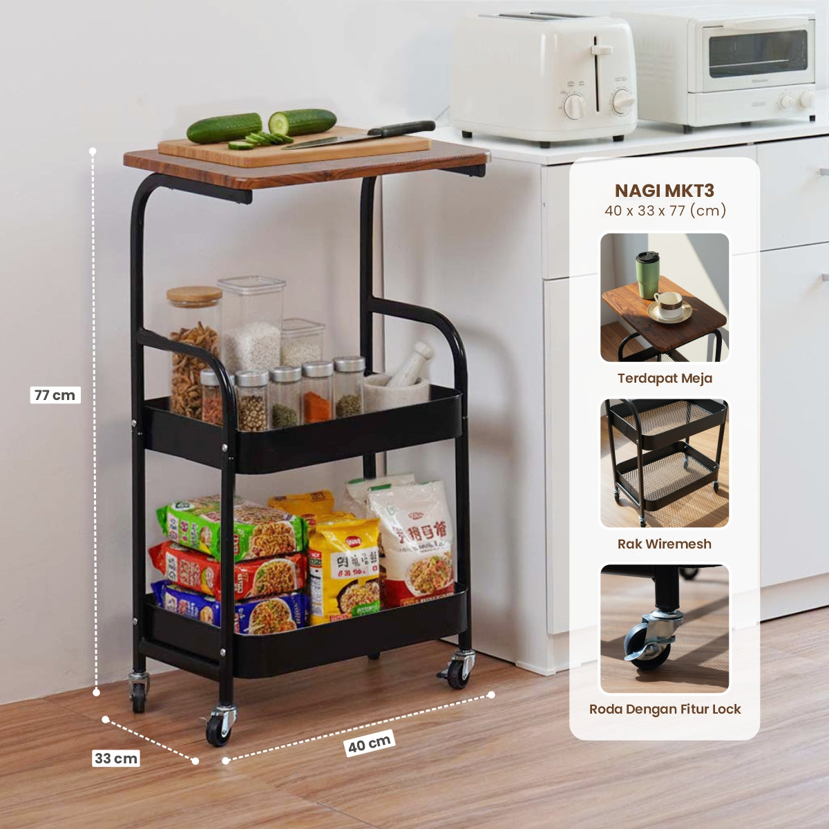 • Jenis Produk: Rak troli / rak penyimpanan serbaguna / rak besi susun dengan meja dan roda.